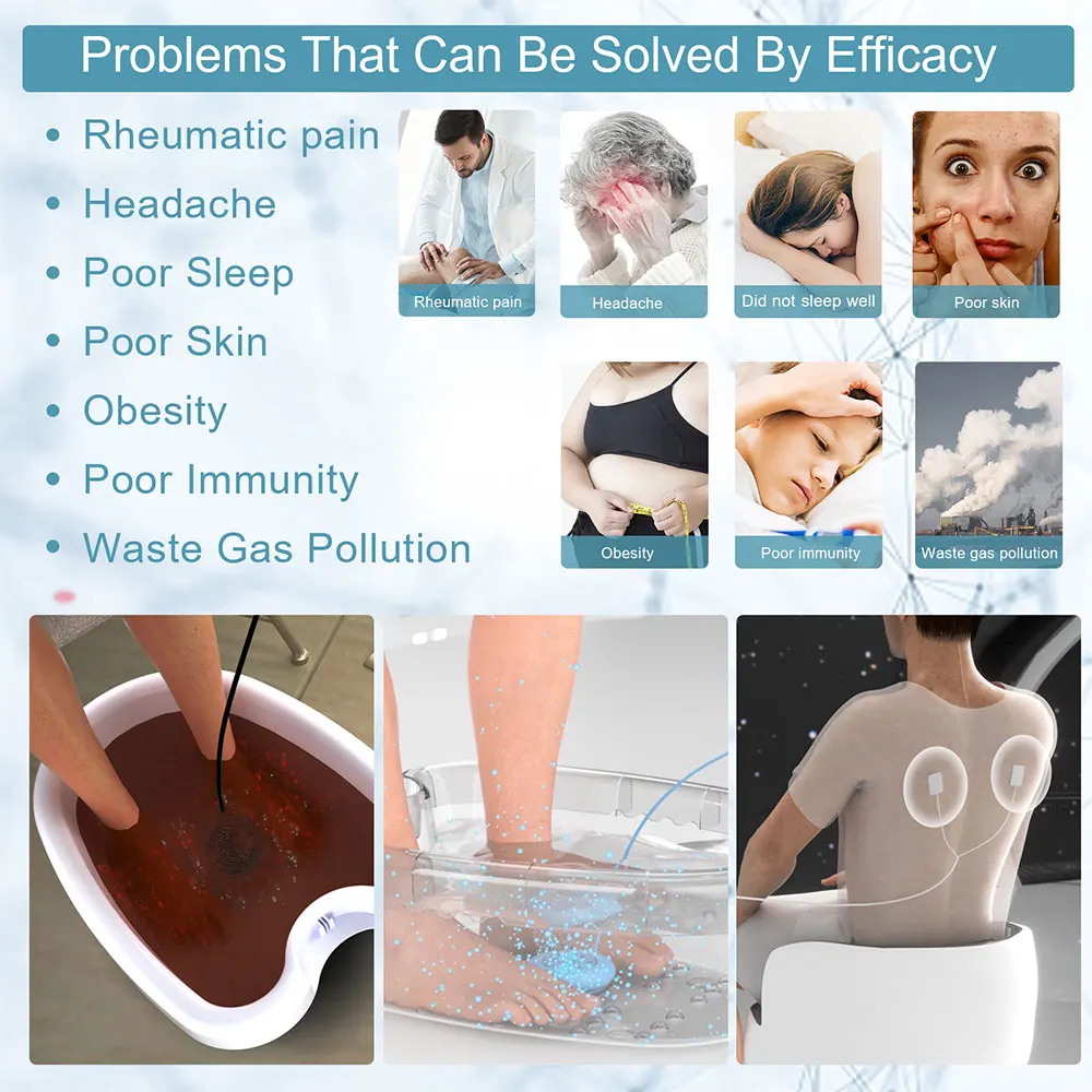 The Foot Detox Machine Foot Bath works by utilizing advanced ionic technology. When you immerse your feet in the bath, the device generates a stream of negatively charged ions in the water. These ions attract and neutralize positively charged toxins in your body. The process is designed to enhance your body's natural detoxification processes, promoting the removal of toxins through the feet. This not only aids in detoxification but also improves overall physiological health by enhancing blood circulation, reducing stress, and supporting the body’s natural healing processes.