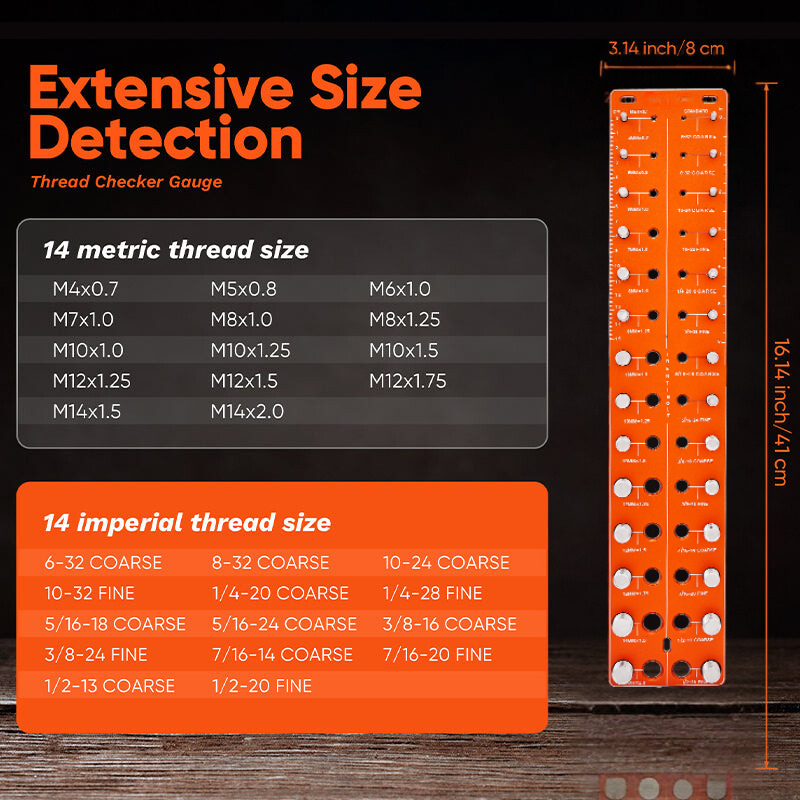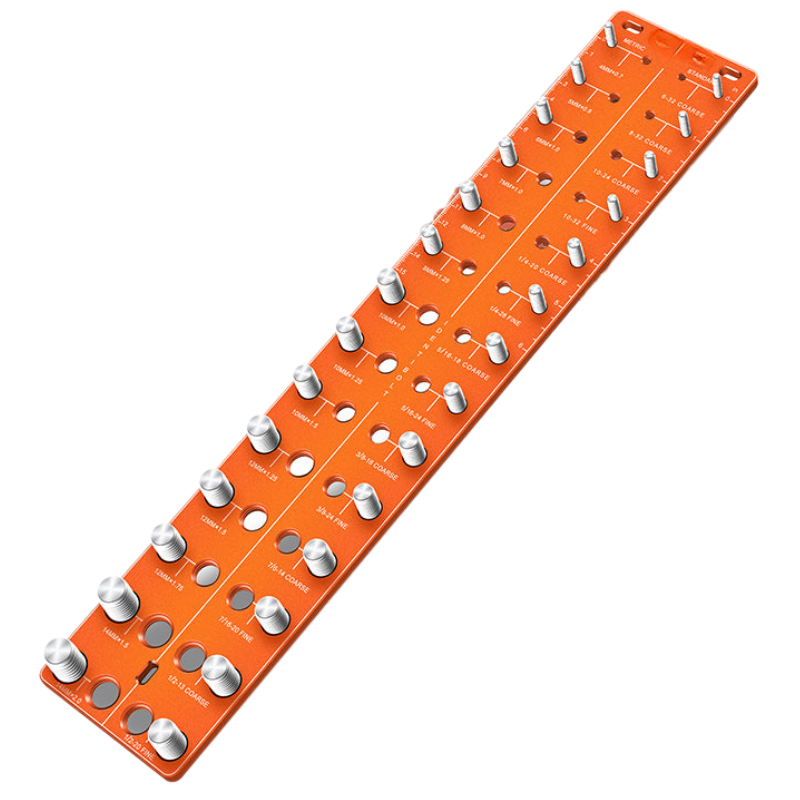 Identify 28 distinct thread sizes effortlessly, including Metric sizes from M4 x 0.7 to M14 x 2.0 and Imperial sizes ranging from #6-32 Coarse to 1/2-20 Fine.