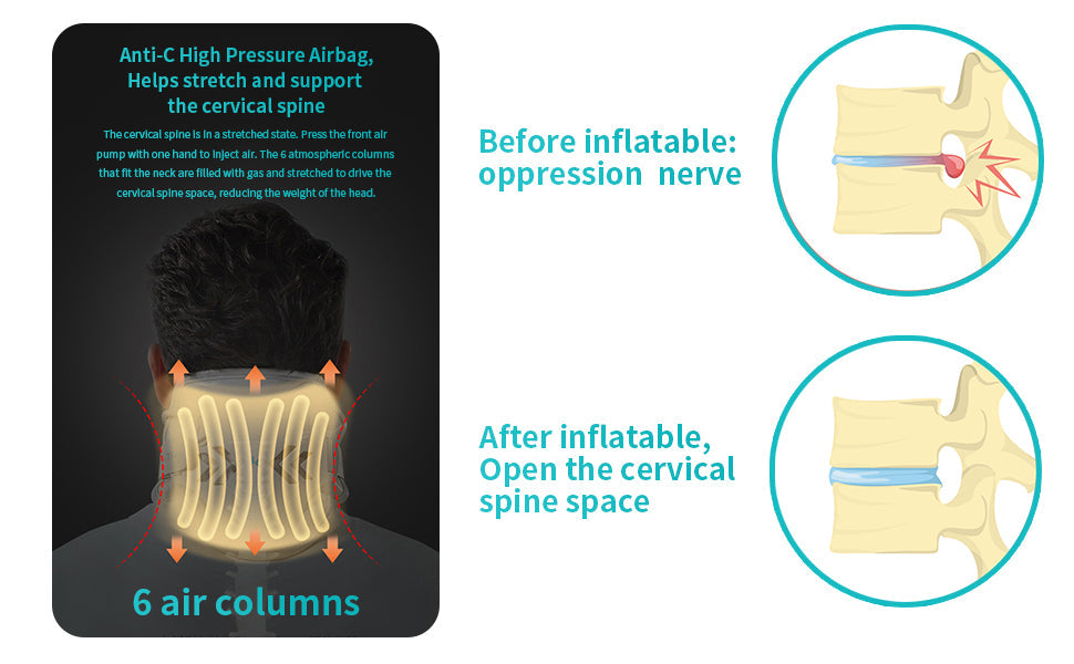 Featuring 2021's innovative neck traction design, this device offers integrated airbag support for enhanced front, back, and arc stretching. Equipped with six built-in air columns, it provides gentle and effective support, promoting comfort and flexibility. Portable and easy to wear, it’s perfect for use at home, in the office, or while traveling.