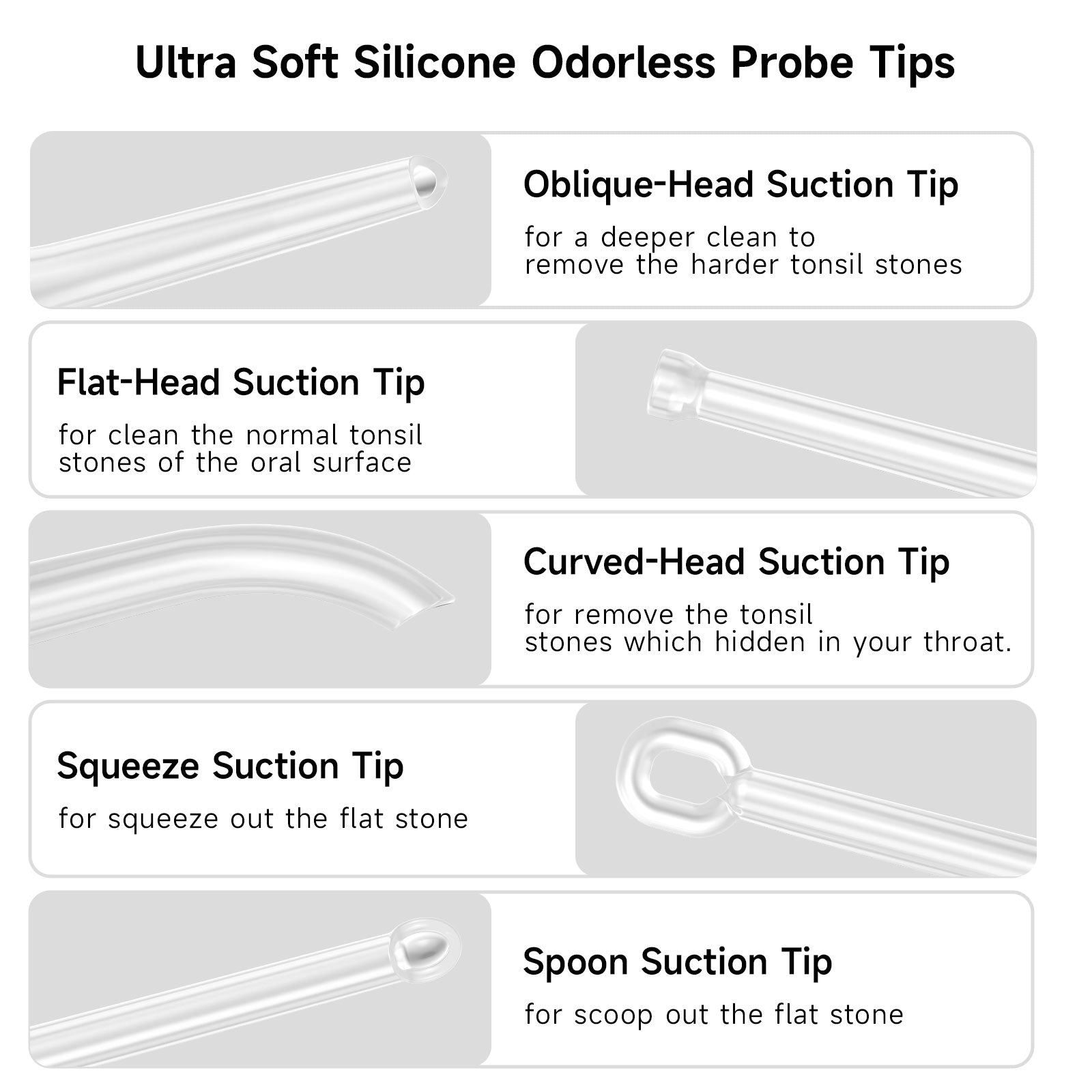 Equipped with 5 food-grade soft silicone probes, this tonsil stone remover provides safe and comfortable contact with your mouth during the cleaning process.