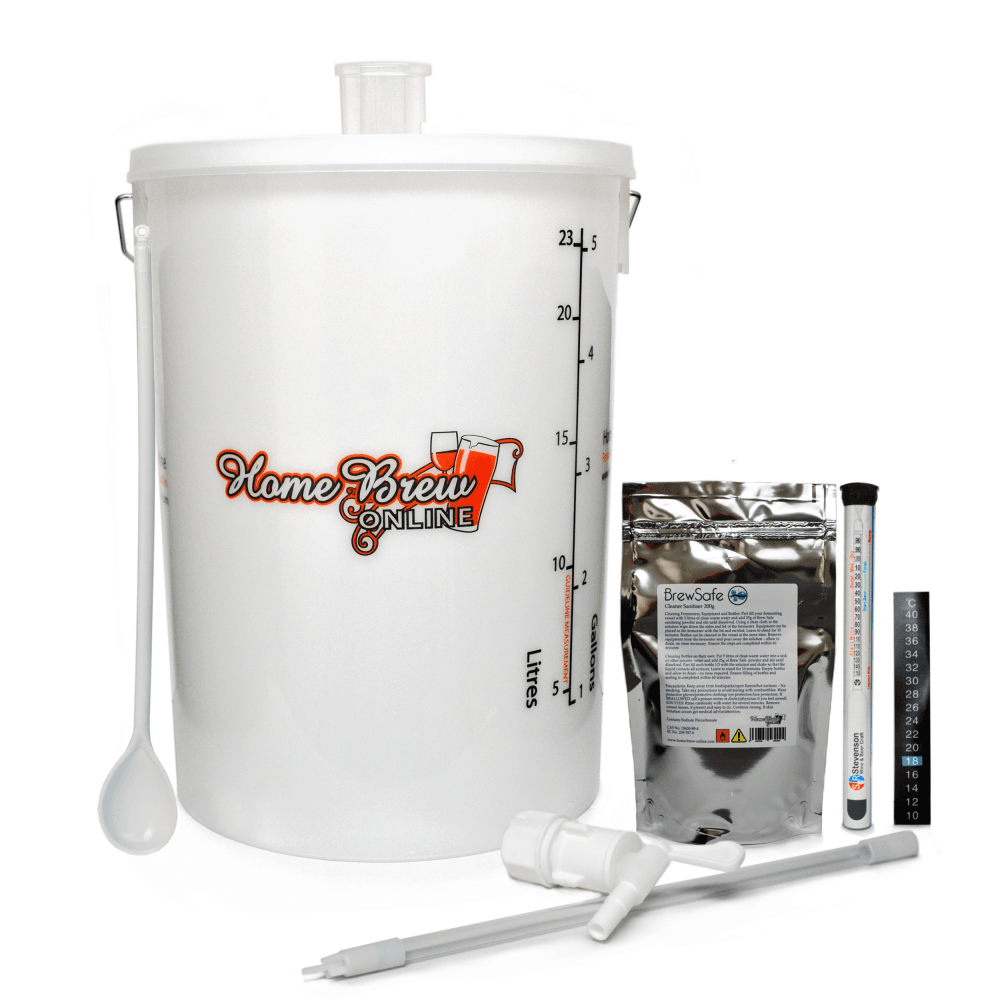 • It includes a fermentation container, an airlock, a plastic stirrer, a small bottler with a tap and sediment trap, a hydrometer, an LCD thermometer strip, and a sanitizer.