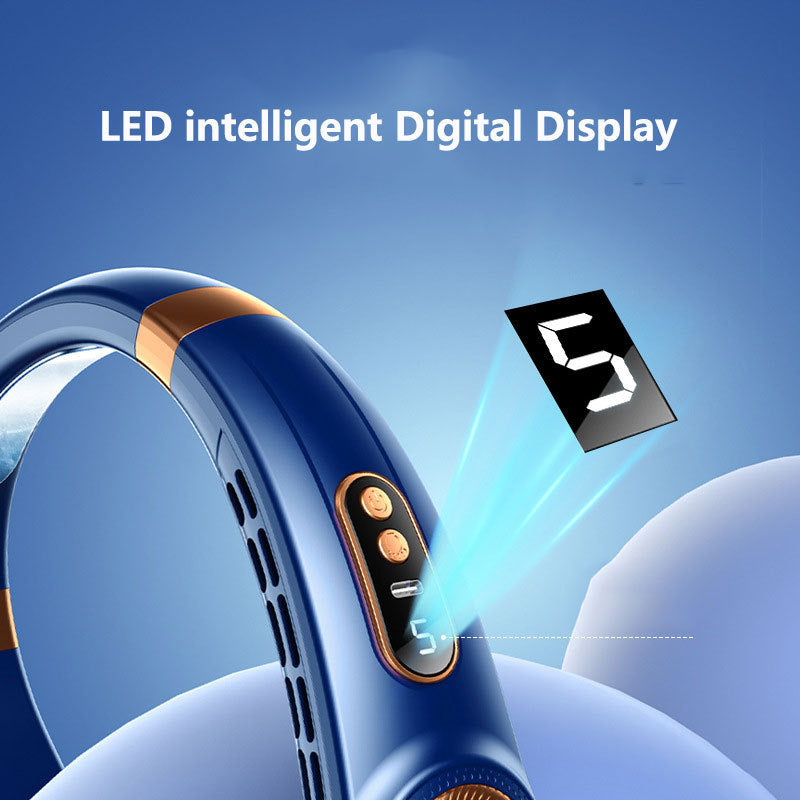 Crafted from durable plastic, our portable neck fan is lightweight and ergonomic, making it easy to wear for extended periods. The bladeless design ensures safe and quiet operation, while the LED digital display and colorful atmosphere lights add a stylish and functional touch to your cooling experience.