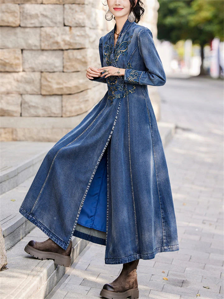 Vintage Aura™ | Ladies Vintage Embroidery Denim Dress | V-Neck, Side Slit Design, Comfortable Fit